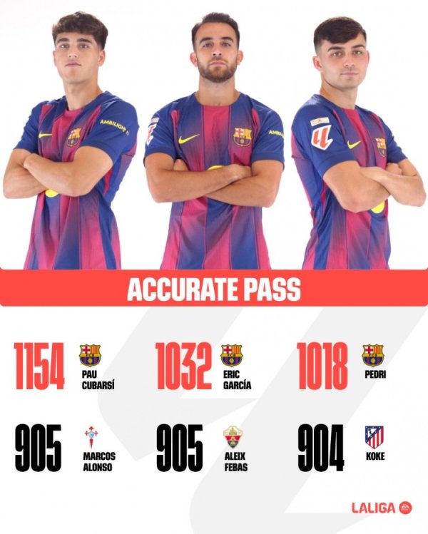西甲官方晒本赛季准确传球次数榜:库巴西居首,巴萨包揽前三