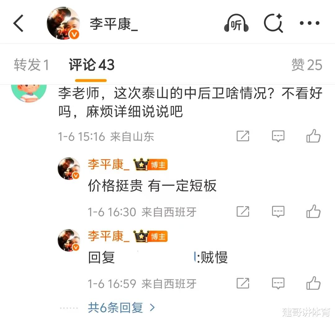 当泰山球迷谋略这位新的外助中卫的情况时,李平康的给他转头了3点,第1点:价钱挺贵,第2点:有一定的短板,第3点:贼慢。随后有球迷和李平康换取的时代称李平康在洛佩斯加盟泰山队前不看好洛佩斯的转头,当今回头看超越准确,这么的情况也让这位以前的泰山队新外助中卫,似乎也很难开脱水货中卫的嫌疑了。