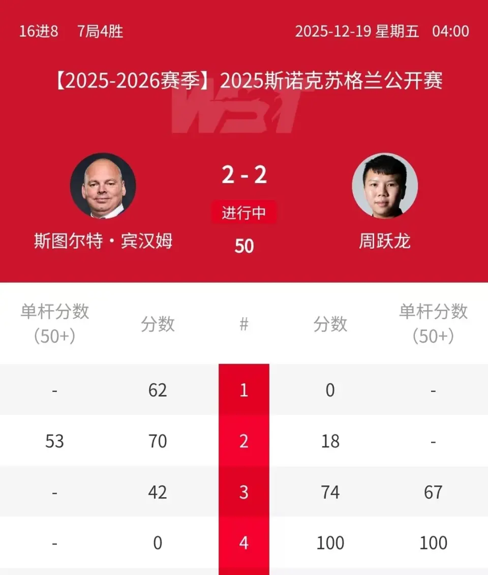 北京手艺12月19日凌晨,2025年斯诺克苏格兰公开赛不息进行。1/8决赛的一场焦点比赛中,“中国147分先生”周跃龙挑战世锦赛冠军“大鲨鱼”斯图亚-特宾汉姆。这场比赛前两局,周跃龙以0-2过时,随后他轰出单杆100分,连扳两局后以2-2追平比分。