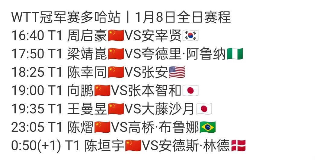 把柄1月8日赛程安排,国乒迎来七场外战,梁靖崑vs阿鲁纳(尼日利亚)、向鹏vs张本智和(日本)、陈垣宇vs林德(丹麦)、男单周启豪vs安宰贤(韩国),按理说周启豪实力在安宰贤之上,但他的问题是临场施展不褂讪,是以说还要看状况如何,梁靖崑这场需精采正手,应该问题不大。