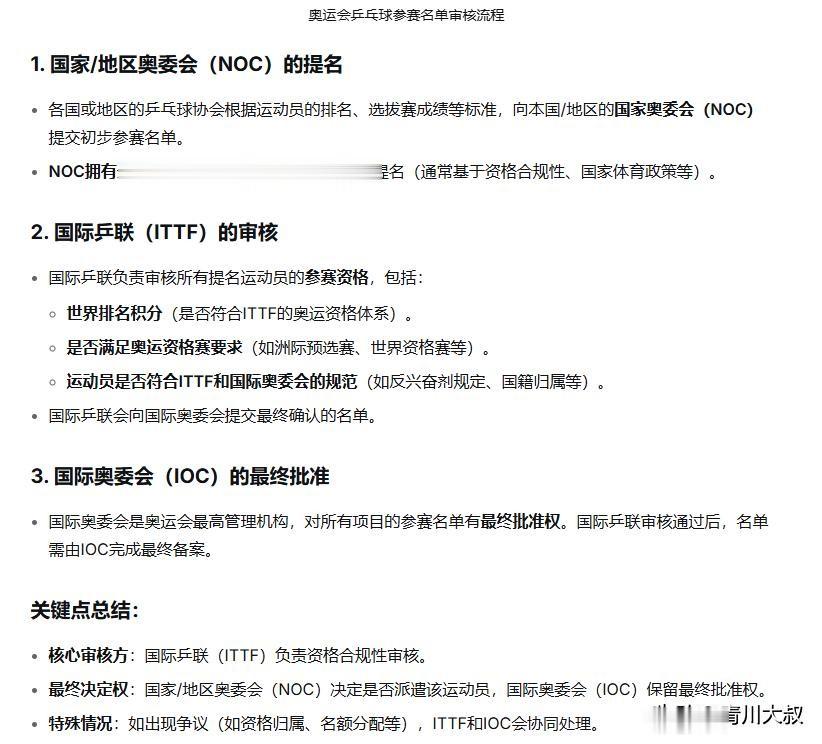 经由是这么的,中国乒协先提交名单,由中国奥委会审核,然后提交给外洋乒联,外洋乒联审核参赛履历,审核的程序其中有一项即是全国排行积分。