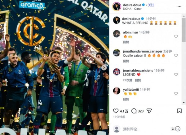 加冕六冠王! 巴黎边锋杜埃社媒晒捧杯照庆祝:何等奥妙的嗅觉