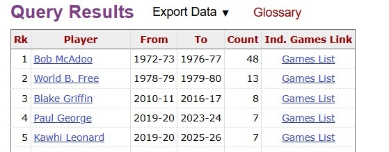 据统计,这是小卡奇迹糊口第11次40+,亦然在快船的第8次,队史追平格里芬,比肩队史第三多,仅次于麦卡杜(48次)和沃尔德·弗里(13次)。