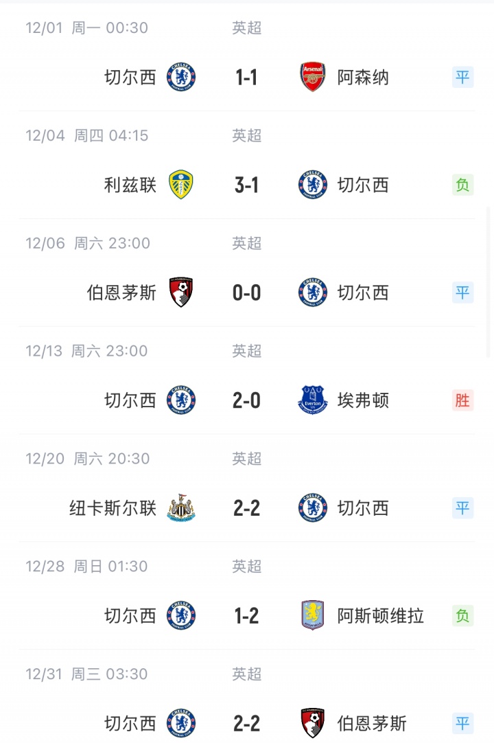 12月31日讯 英超第19轮,切尔西2-2战平伯恩茅斯,遭逢三场不堪。