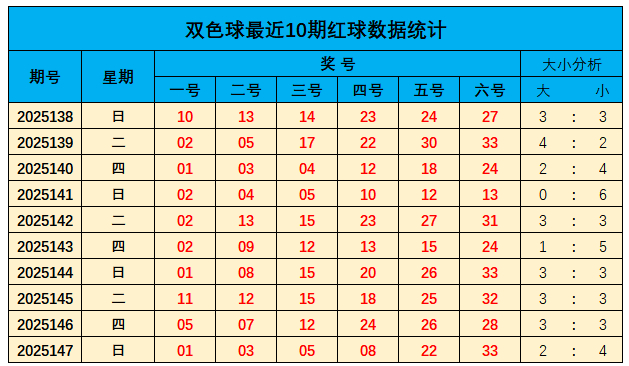 上期红球大小比为2:4,近10期大小比为24:36;总体上小奖号走势稍热,本期暄和大数较上期走势升温,推选大小比为:4:2