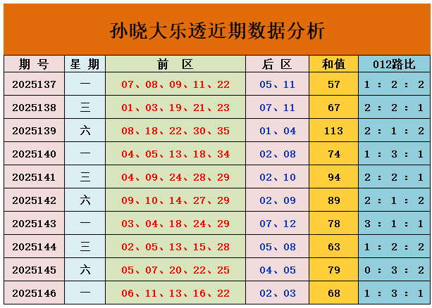 上期纪念:大乐透第2025146期奖号:前区06、11、13、16、22,后区02、03,前区奖号和值为68,三区比为2:3:0,后区开出小小组合02、03
