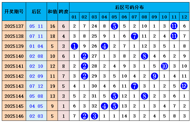跨度分析:上期后区跨度为1,与前期比较下落0个点位,料想本期跨度走势波动高潮,推选两码跨度5--9