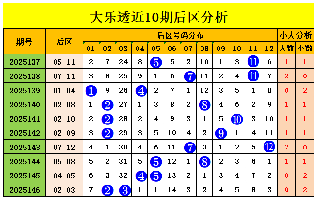 后区近10期大小比为9:11,小码奖号走势稍热,上期开出小小组合,近3期开出,小大、小小、小小、组合,本期后区推选小大组合;