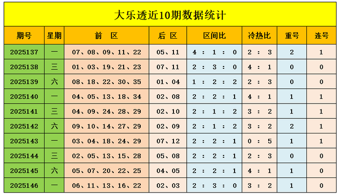 上期总结:大乐透第2025146期奖号为:前区06、11、13、16、22,后区02、03,前区奖号三区比为2:3:0,冷热比为3:2,后区开出小小组合02、03