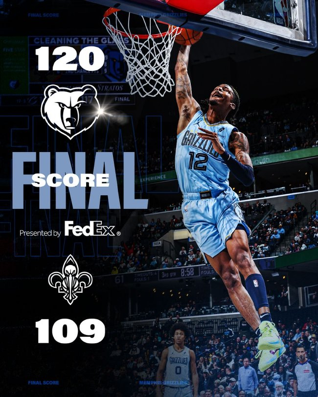 莫兰特复出,18投10中,罚球7中7,砍下27分3篮板7助攻3抢断率队取胜,灰熊获得5连胜,以13胜7负的战绩名次西部第四。