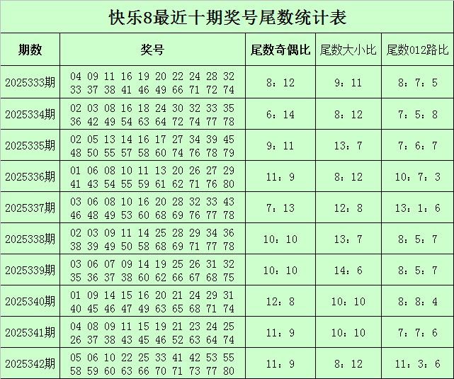福彩欢快8第2025342期开奖总结:05 06 10 22 25 33 41 42 53 55 58 59 60 63 66 70 71 73 77 80,其中奖号余数012路比为11:3:6,余数大小比为8:12,奇偶比为11:9。