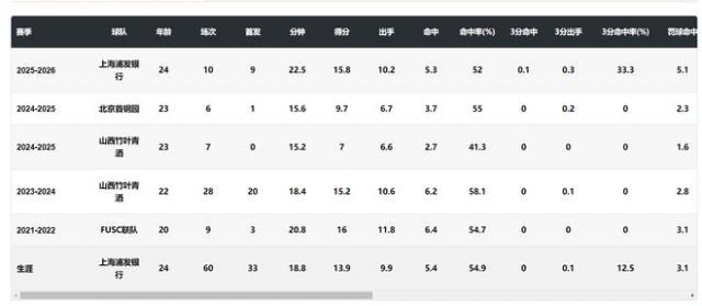 本赛季的刘禹彤来到上海后迎来了我方的巅峰赛季,场均 22.5 分钟,拿到 15.8 分 4.5 篮板 1.1 助攻 0.7 抢断 0.4 盖帽,掷中率 52%,得分是 WCBA 生存新高,篮板是 WCBA 生存第二高。